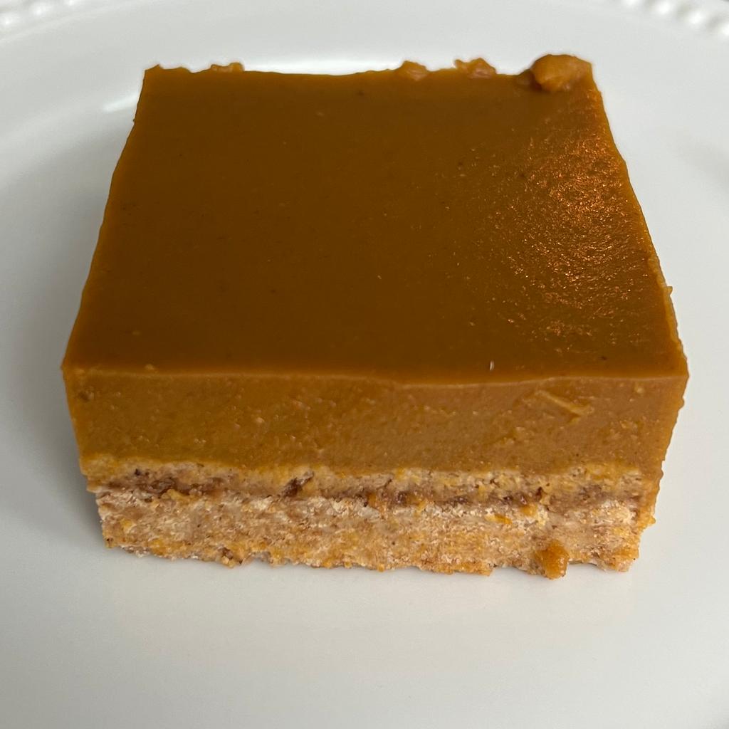 In saucepan, bloom gelatin over coconut milk. Add all remaining ingredients, except for pumpkin, and heat mixture over low heat until gelatin is liquid. Whisk in pumpkin puree and remove from heat. Let cool briefly and then pour over crust. Refrigerate until set. Cut into bars to serve.